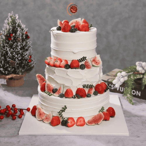 - Hình dạng: Tròn, trang trí hoa quả dâu tây và việt quất.